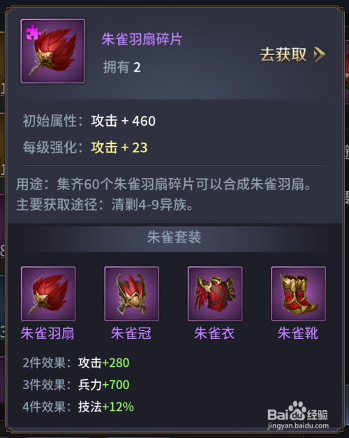 朱雀套装2件可以晋升本家儿公280点的进犯,3件晋升军力700,4件晋升技法危险12%,获取方式为击杀4-9级的外族,或在铸铁商铺兑换碎片。
