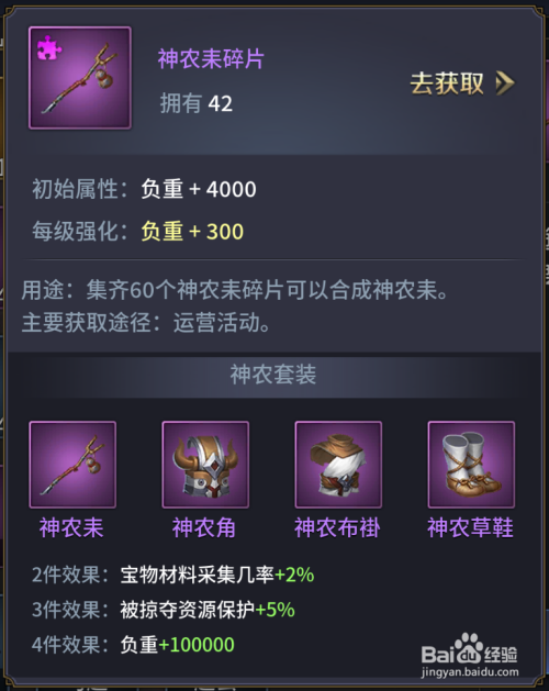 神农套装的获取体例比力少,今朝只能经由过程国战商铺采办获得。套装中每件装备的合当作都需要同类碎片60片。若是拥有套装中的两件就可以晋升宝贝材料采集几率2%,拥有3件则可以庇护被打劫资本的5%,4件则可以增添负重达到10万,此套装适合给外出进行野外资本采集的步队利用。