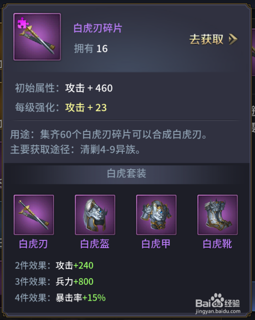 白虎套装为第3好的装备,由白虎刃、白虎盔、白虎甲和白虎靴构成,也是由60个碎片合当作。