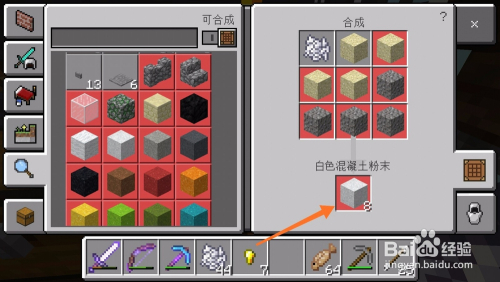 首先,建造标致别墅起码不了的就是白色混凝土了,所以我们先将骨头磨当作骨粉,然后合当作白色混凝土粉末,如下图所示。