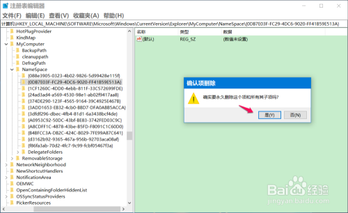 第二步:删除NameSpace键项下的 {0DB7E03F-FC29-4DC6-9020-FF41B59E513A} 键项。