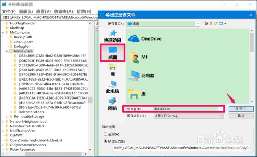 在打开的导出注册表文件对话框中,我们先点击【桌面】,在文件名(N)栏中输入 NameSpace,再点击:保留。