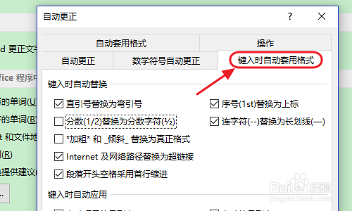 ②在主动更正对话框,我们点击右侧的“键入时主动套用格局”,然后勾选“分数(1/2)替代为分数字符(½)”,如许今后我们仍是按照本身之前的习惯输入分数即可,系统会主动帮我们更正过来,如图所示...