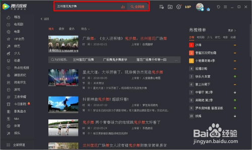 首先打开腾讯视频播放器(若是没有可以下载安装一个),在本家儿页面的搜索框那边输入:兰州莲花鬼步舞,然后点击全网搜刮(也可直接按回车键)就起头进行搜刮了。