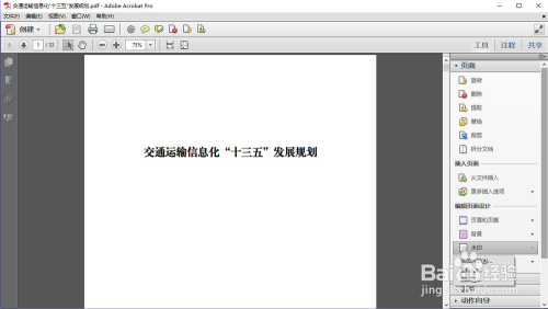 利用Adobe Acrobat Pro软件打开需要添加水印的pdf文档。点击菜单栏->视图->东西->页面。