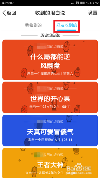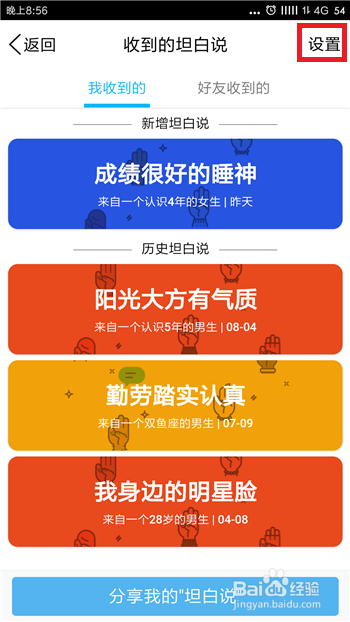点击后进入【收到的率直说】界面,在右上角找到并点击【设置】。