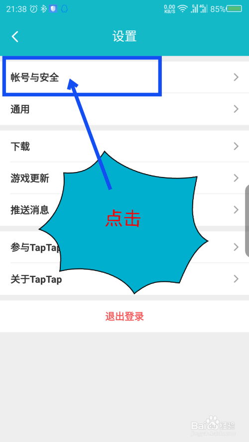 在设置界面,点击第一个选项账号与平安。如图所示
