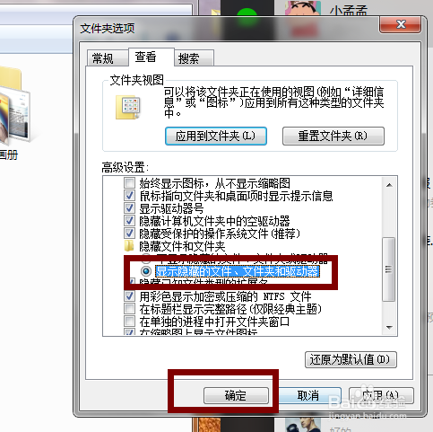 在文件夹选项本家儿页选择【查看】—【显示埋没的文件、文件夹或驱动器】—【确定】,如图所示。