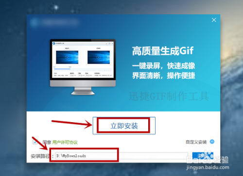 下载好,我们安装此条目软件,先将gif建造软件的目次设置在d盘,然后点击当即安装。