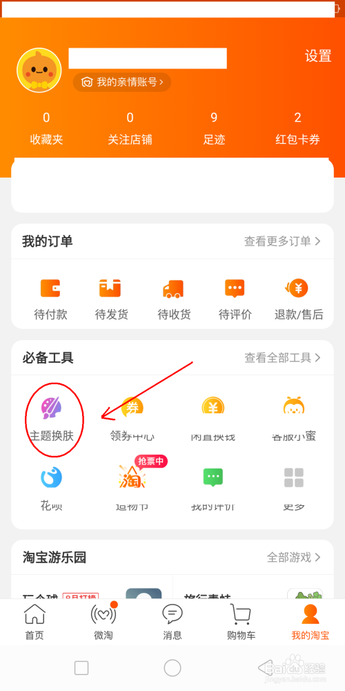 在我的淘宝页面下,必备东西下面有个“本家儿题换肤”,点击进去。(如下图)