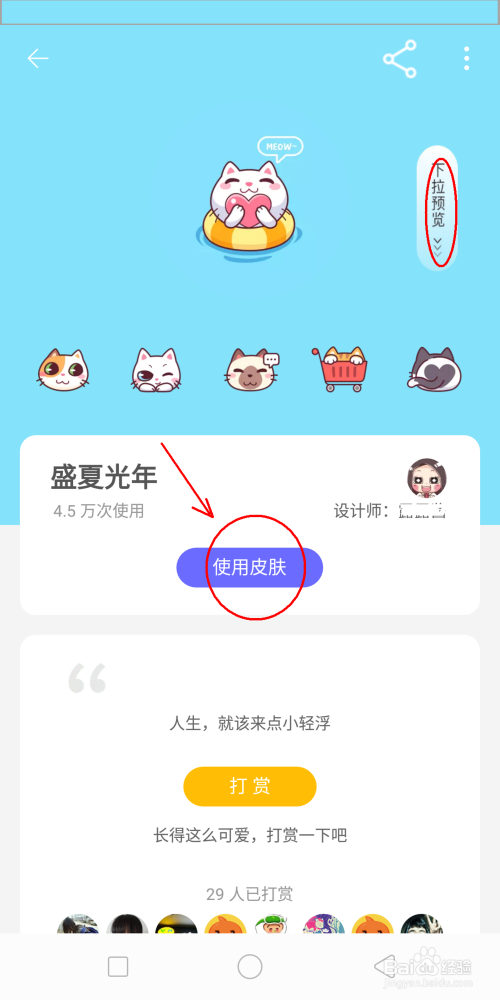 在本家儿题图片这可以看到图片还可以下拉预览,喜好就点击“利用皮肤”。(如下图)