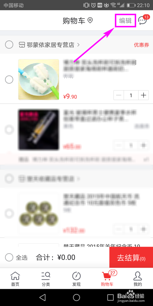 接着在购物车页面右上方找到并单击【编纂】按钮,如图所示。