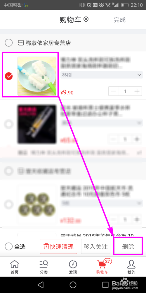 然后点击选摘要删除的商品前面的复选框,将其勾选,然后点击屏幕右下方的【删除】按钮。