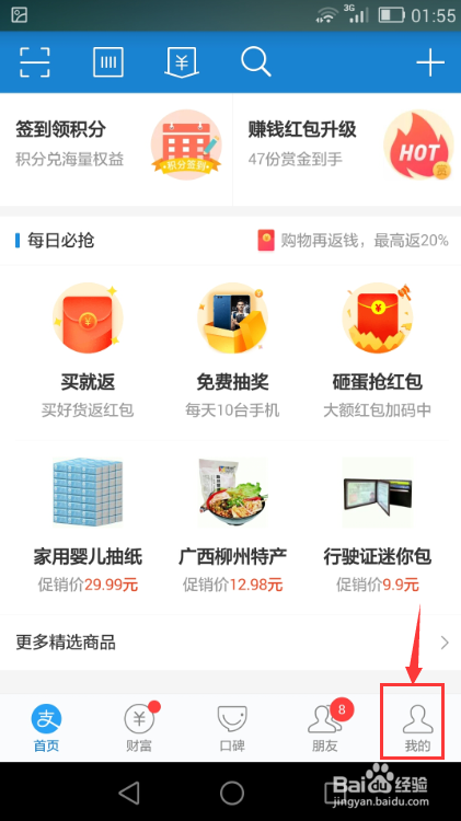 进入付出宝本家儿页面,点一下我的;