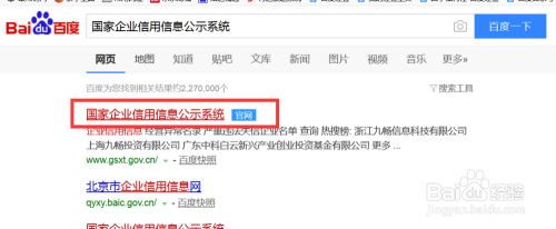 2.打开仗狐浏览器之后,在地址栏输入百度搜刮的网址打开百度搜刮,并在百度搜索框中输入【国度企业信用信息公示系统】,点击官网链接,如下图所示。