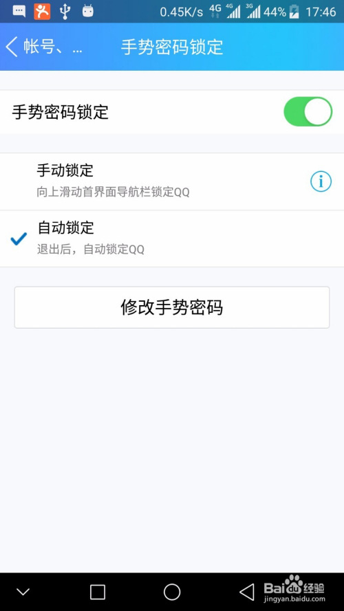 手势密码设置好今后,可以设置手动上锁仍是主动上锁。