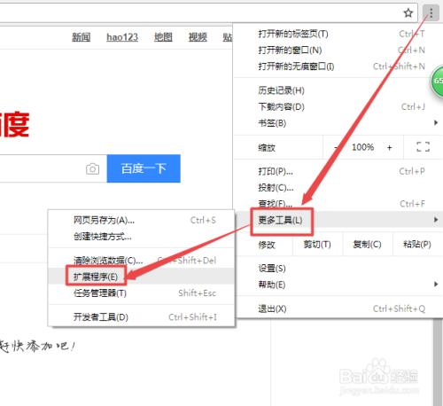 然后会来到浏览器默认打开的页面,点击右上角的 自界说及节制 图标,在弹出的页面中国将鼠标放在更多东西上面,在呈现的子菜单中点击扩展法式选项。