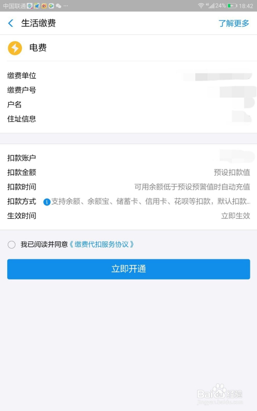接着选择你要开启缴费代扣的选项,这里以电费为例,点击厥后的“当即开通”。