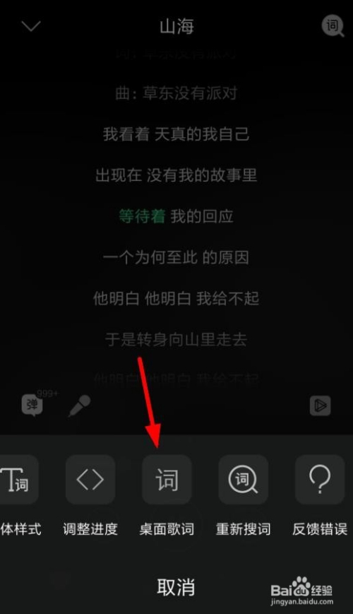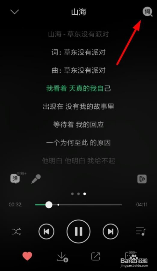 首先我们打开手机QQ音乐。选择一首歌在歌词的右上角。会看到一个“词”字,我们点击。