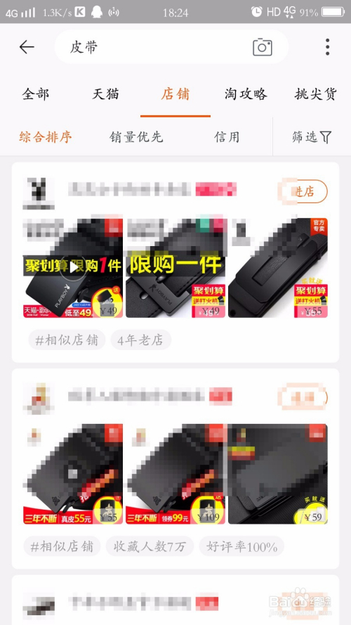 我们选择”店肆“界面,在这里我们可以看到很多常见的皮带品牌,这些店肆都是专卖店,工具一般都是正品,价钱也会比力正常,我们浏览一下,可以给我们做一个参考。
