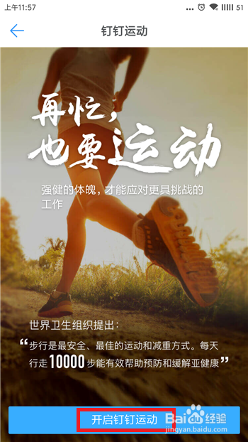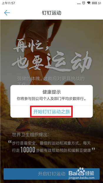 点击后会有个健康提醒,提醒我们开启后将介入到公司小我及部分的排行,点击【开启钉钉活动之旅】。