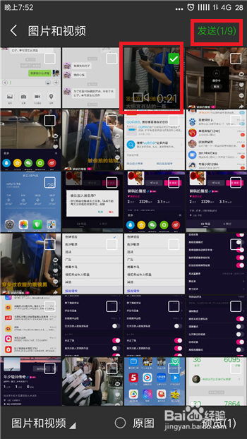 在手机相册中找到适才保留到手机的微视视频并选择,点击右上角的【发送】即可。