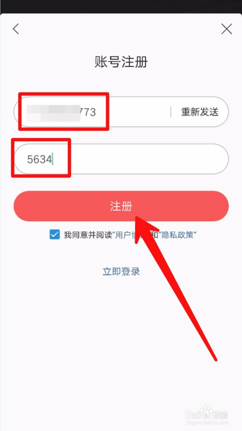 然后获取手机验证码、输入验证码、并点击箭头所指的【注册】按钮。如图所示