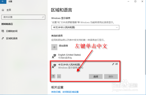 在首选的说话下面,左键单击选中中文,若是没有中文点击添加。如图所示
