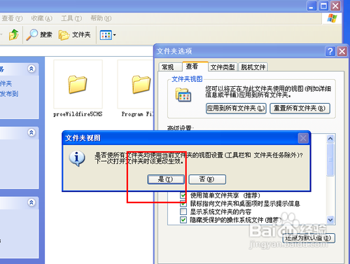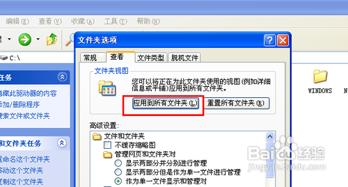 然后文件夹选项之后,我们点击“查看”选项卡,然后按照图片的提醒进行下一步操作。这里我们点击“应用到所有文件夹”,点击“确定”,并保留相关设置。