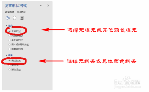 进入外形格局后,我们可以将填充选择为“无填充”或设置为其他颜色填充,将线条设置为“无线条”或其他颜色线条。