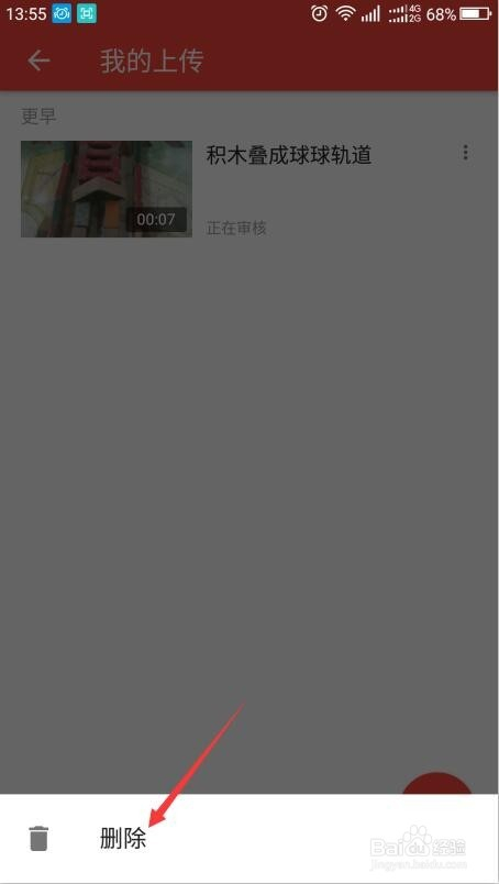 上传好后,显示正在审核,经由过程审核后别人才能看到。若是想删除该视频,则点击右侧的三圆点按钮,底部呈现删除,点击即可删除视频。