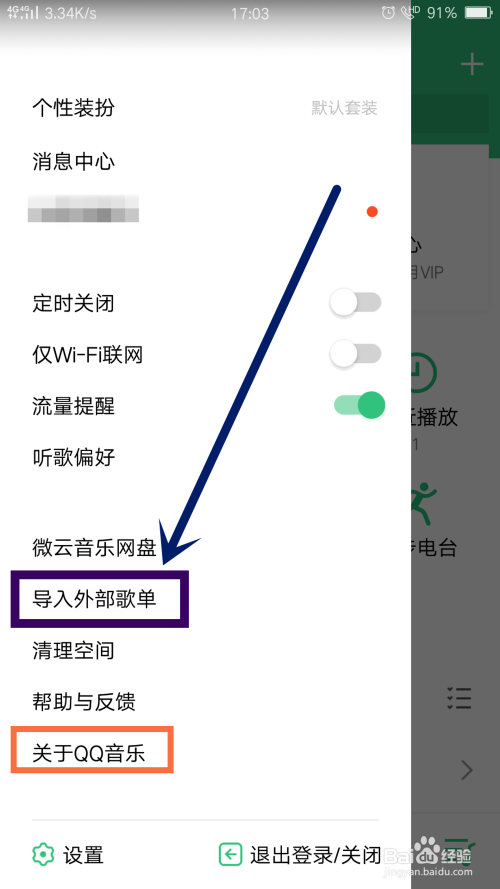 然后点击打开QQ音乐APP,在其菜单中点击打开-导入外部歌单,如图所示