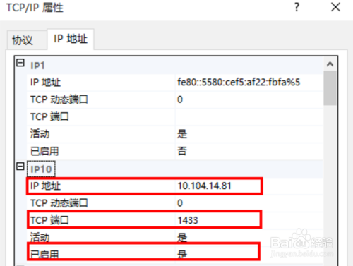 启用后,在TCP/IP上点击右键,选择“属性”,将选项卡切换到“IP地址”页,在肆意IP处,设置好IP地址,TCP端口,并将“已启用”设置为“是”,如下图所示: