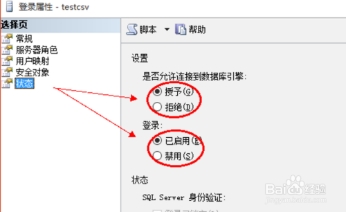 在”状况“选项页,将”是否许可毗连到数据库引擎“选为”授予”,将“登录”设置为“已启用”,如下图所示: