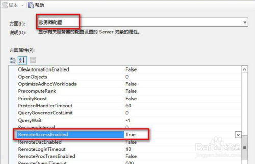 在右侧的方面下拉框中选择 “办事器设置装备摆设” ;将 “RemoteAccessEnabled” 属性设为“True”,点 “确定”,如下图所示: