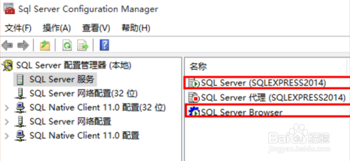 启动SQL Server Configuration Manager(简写SSCM),确保右侧的“SQL Server(实例名)”和“SQL Server Browser”的状况都为“正在运行”,如下图所示: