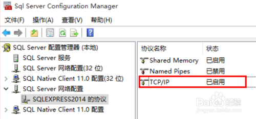 同界面下,在SQL Server 收集设置装备摆设下,有SQLEXPRESS2014的和谈,将TCP/IP的状况,设置为启用,如下图所示: