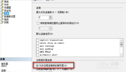 在不异界面,左侧选择 “毗连” ,勾选 “许可长途毗连此办事器” ,然后点 “确定”,如下图所示:
