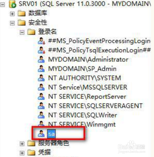 睁开“平安性”→“登录名”→选摘要登录的帐号,凡是是”SA“,右键 “属性”,如下图所示: