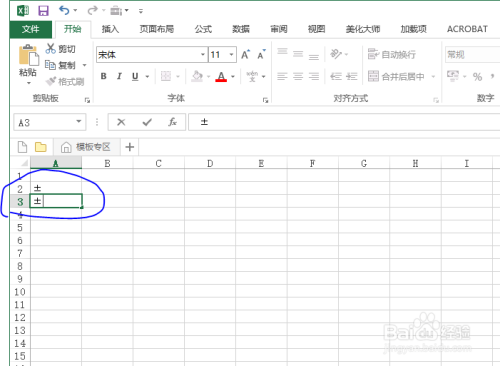 选中A3单位格,按下组合键Alt不松,然后依次在小键盘数字区依次按下1,7,7(即快捷键Alt+177)即可。