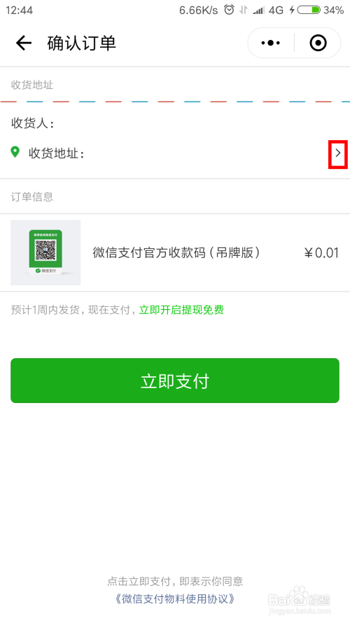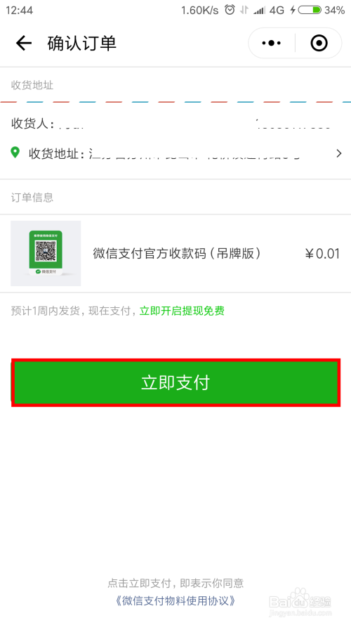 填写好收货地址,点击"当即付出"进行付条目。