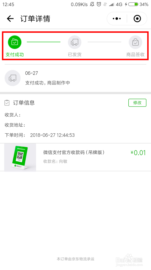 封闭提醒后可以看到订单付出当作功,我们静等收货即可。