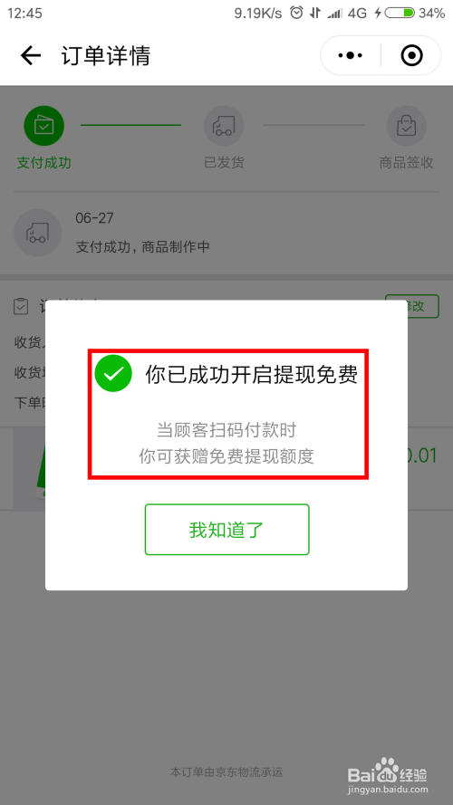 付出当作功后会弹出提醒"你已当作功开启提现免费"。