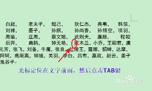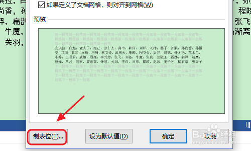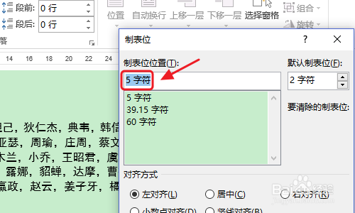 然后在弹出的对话框左下角找到“制表位”,然后设置一个制表位的字符长度,不宜过长要按照里面文字的长度而定,一般5个字符足够,设置今后我们将光标定位到名字前面,点击tab键就会将文字标的目的制表位对齐,所有的名字全数做如许的设置;