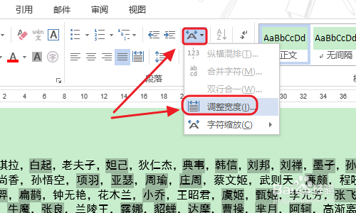 接下来我们封闭此对话框,返回到文档今后,会有部门文字被选中,如图一;接着依次点击“中文版式”-“调整宽度”,我们将新文字的宽度调整为3,因为今朝文档中最长的字符就是3;