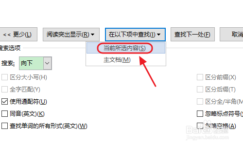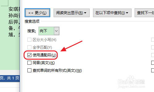 然后打开快捷键Ctrl+H打开查找和替代窗口,在查找输入框输入“<(?)(?)>”,点击左下角的“更多”今后勾选“同样通配符”以及“当前所选内容”,如图所示...