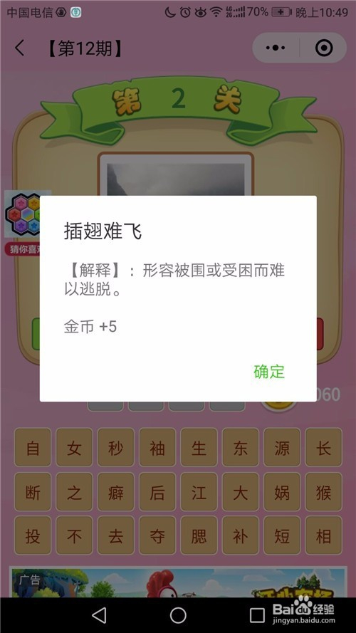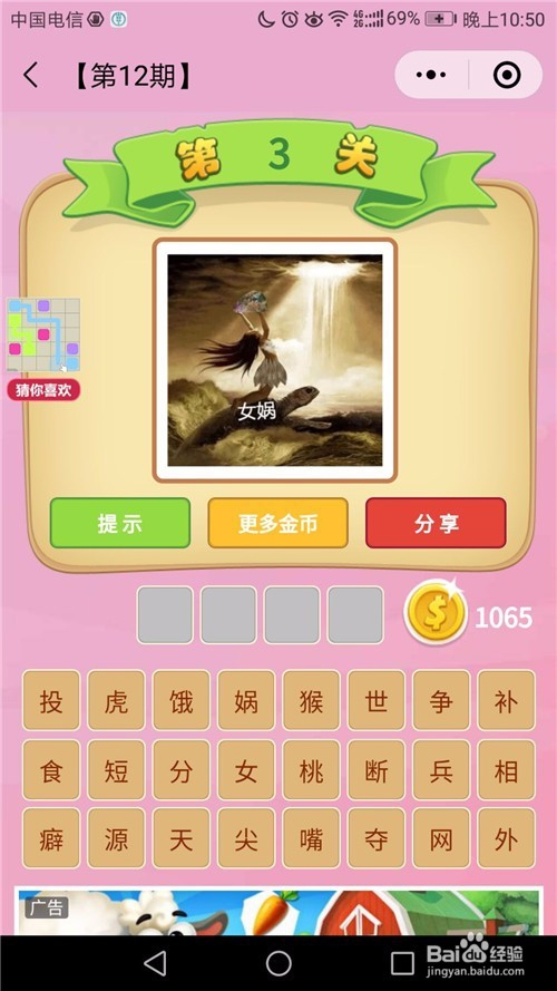 来看第3关,丹青里的文字只有2个字“女娲”,再来看丹青,一个女孩子双手举着一块硕年夜的钻石,头顶天上有个年夜洞。