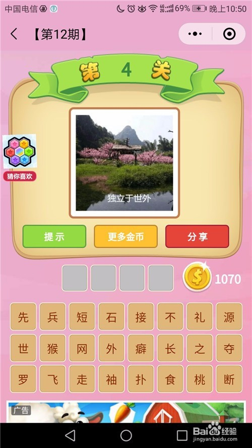 来看第4关,一片开着粉色花朵的树林,有山有水,配文“自力于宿世外”。