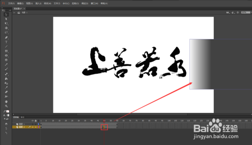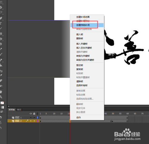 单击场景返回场景舞台,选中两个图层,在两个图层的第60帧处按F5插入帧;选中图层2的第一帧,将矩形移动到毛笔字的左侧,在图层2的第50帧处按F6插入一个关头帧,然后将矩形移动到文字的右侧位置;然后在图层2的第1帧与第50帧之间右键鼠标选择建立一个传统补间动画。