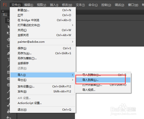 选择菜单栏中的文件菜单,选择导入中的导入到库号令,在弹出的文件导入窗口中找到并选中我们提前筹办好的毛笔字素材进行导入,导入之后我们打开“库”窗口会看到我们导入的毛笔字素材图片就已经在库中了。